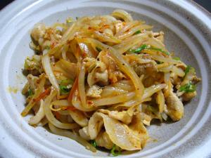 豚肉の色が変わってきたら、もやしと白菜・キムチを加えてさらに炒め完成。 |