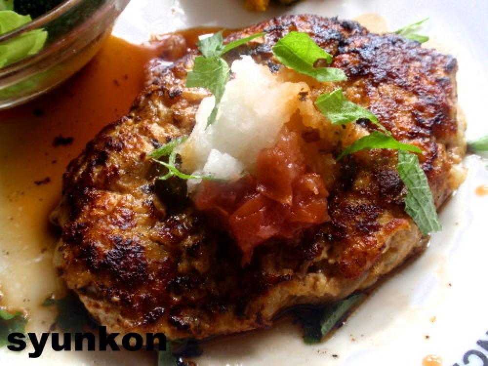 ![]() ハンバーグの上に大根おろしと、タネを取って包丁で叩いた梅干しを乗せ、今のソースをかけ、大葉をちぎってちらす。