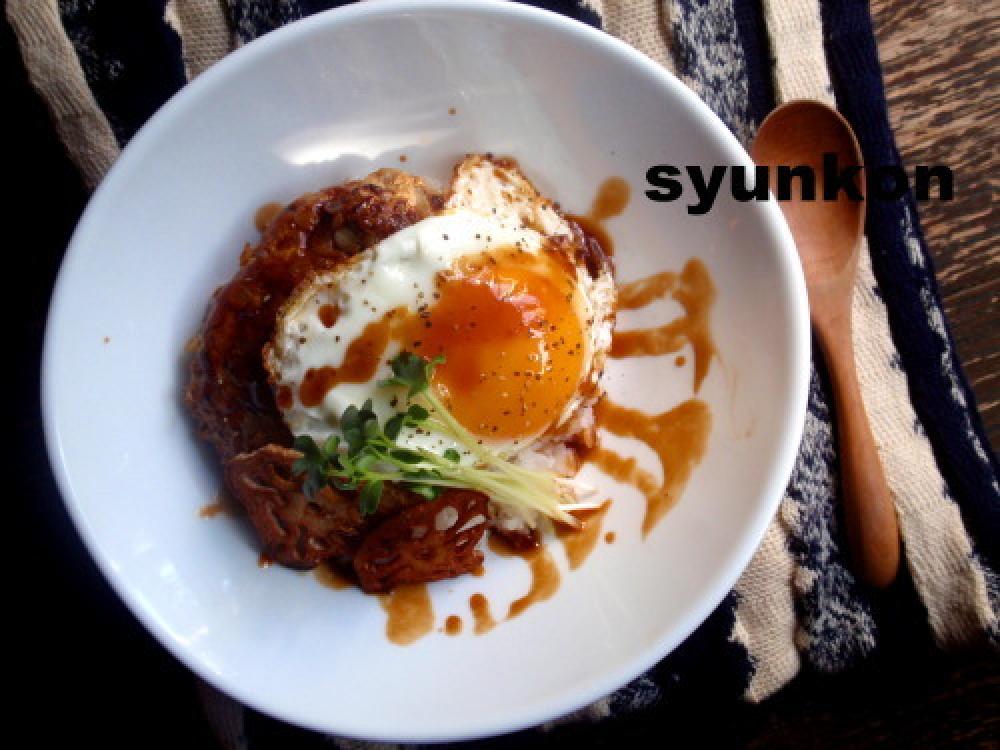 ![]() 器にご飯を盛り、ハンバーグをのせ、今のソースをかけ、目玉焼きやら色々乗せる。
