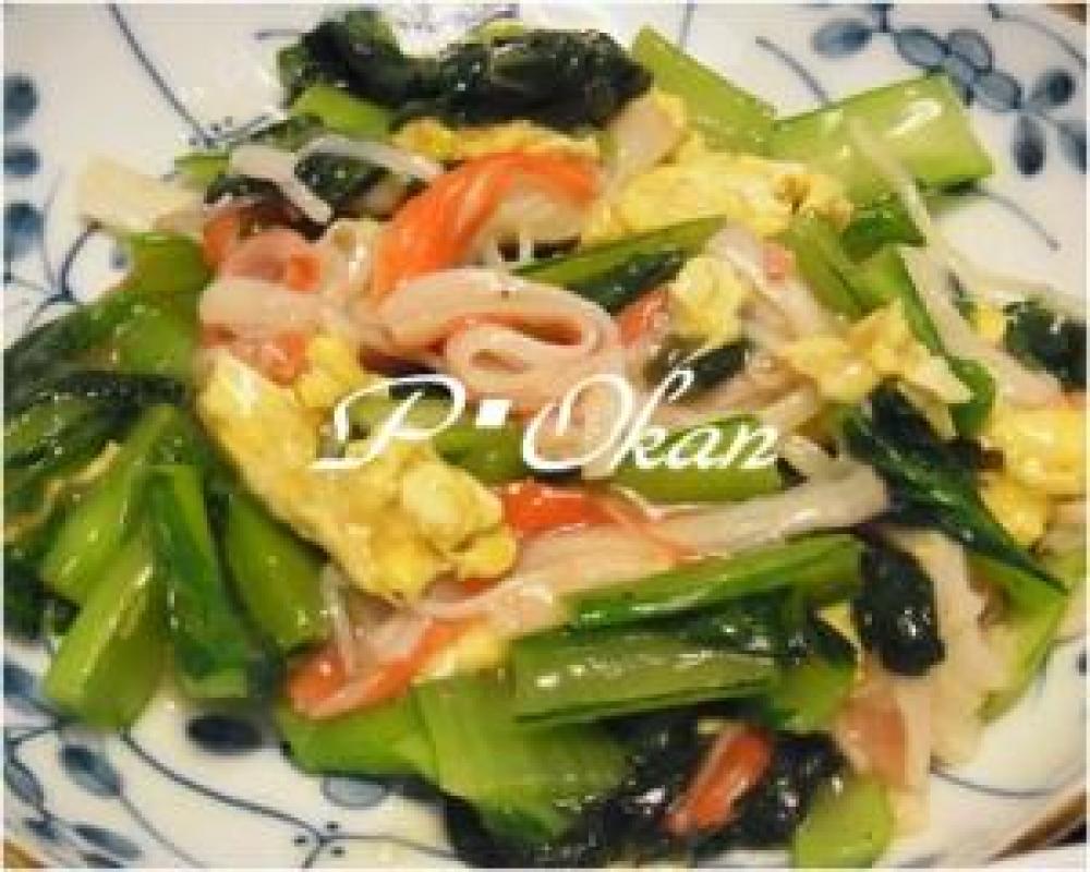 フライパンで小松菜を炒め、調味料を入れる。カニカマを卵も入れて最後に調味料も入れて◎入れてとろみをつけたら出来上がり。