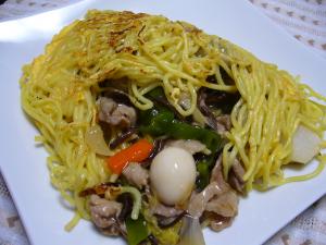 めんの中央に、八宝菜のあんをのせて、めんをほぐしながら少し広げて、まわりをあんにかぶせていく。