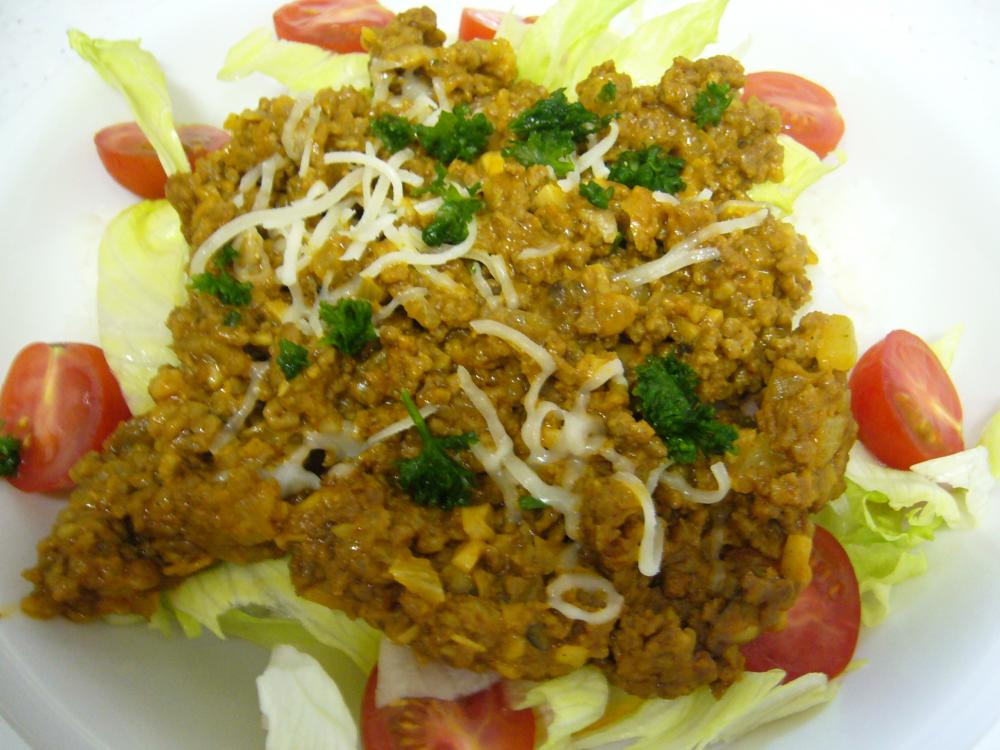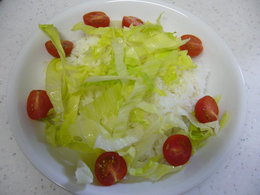 ![]() お皿にごはん・レタス・トマトを飾り、その上に②のカレーをかける。