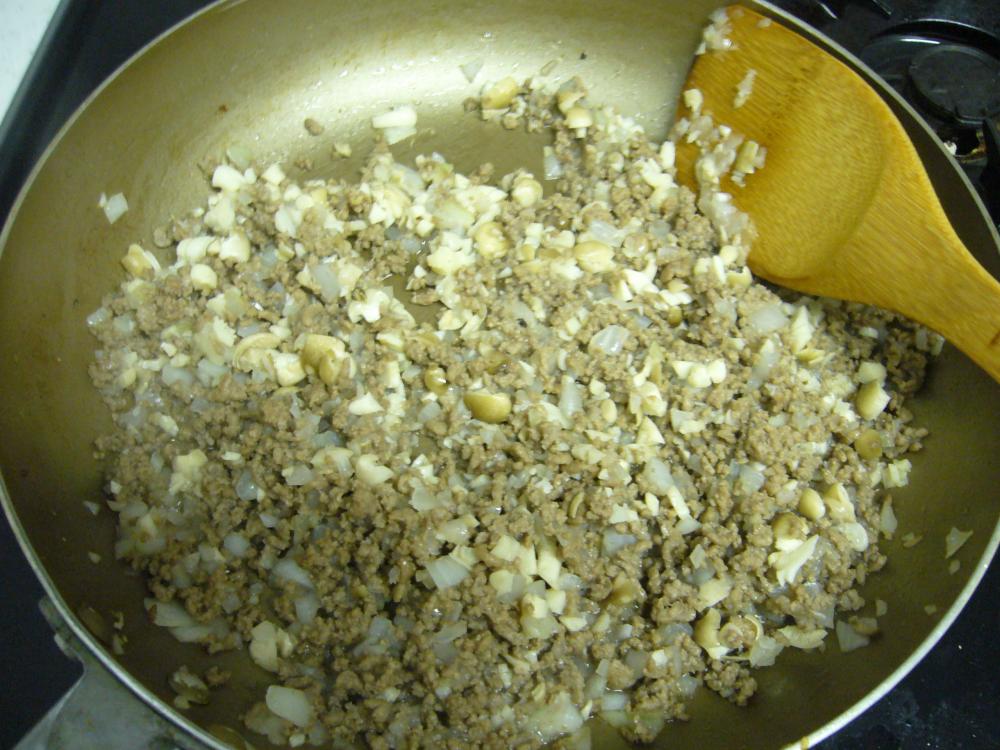 ![]() フライパンでひき肉を炒め、塩こしょうをする。色が変わったら、玉ねぎをしめじを加えてしっかり炒める。