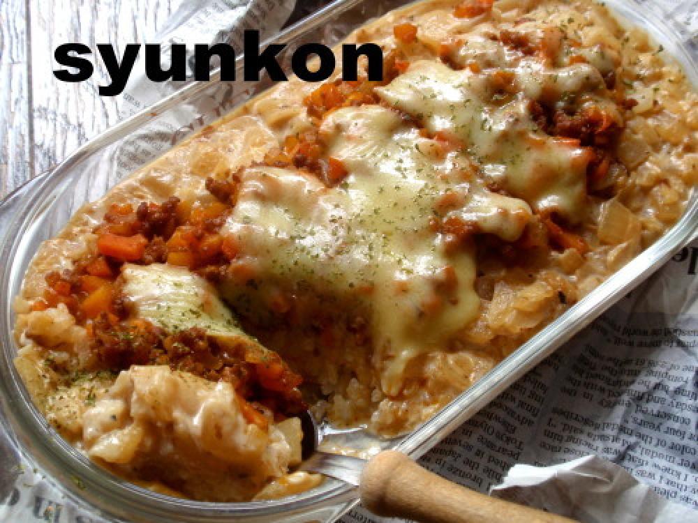 グラタン皿に、ご飯を入れ、ホワイトソースをかけ、上からミートソースをのせ、