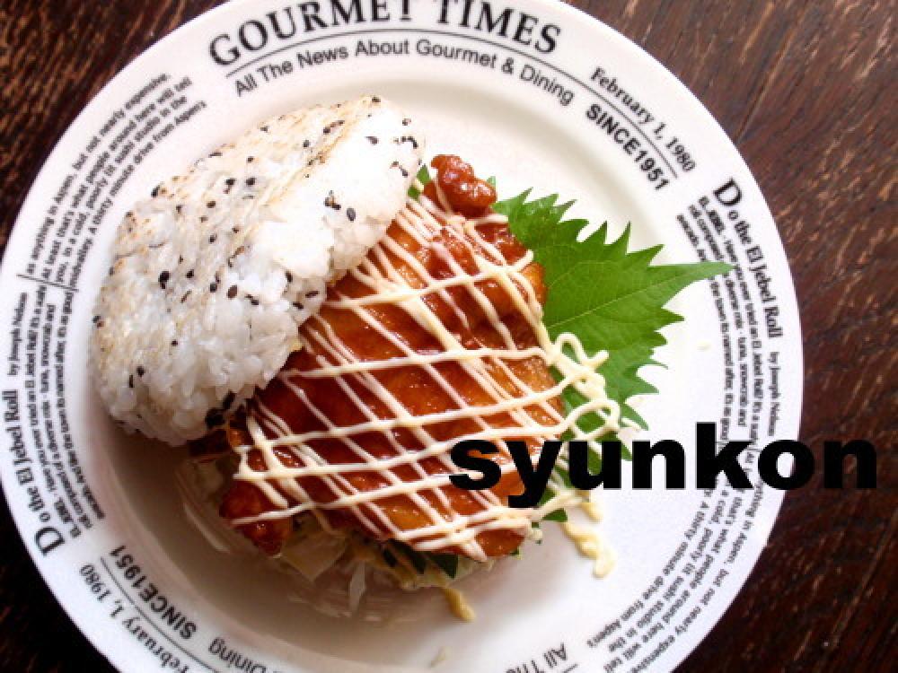 ![]() マヨネーズをラップに絞って爪楊枝で穴をあけてぴゅーっと細く搾り出して、もう1枚のご飯を立てかけて、完成。