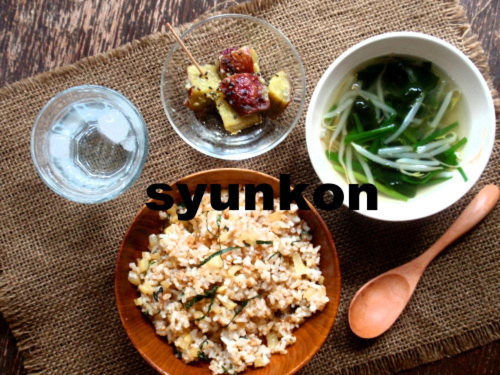 ![]() フライパンに油を注ぎ、たくあんを炒め、ご飯、大葉、ゴマ、塩を加えて炒め、最後に醤油を鍋肌からまわしかける。