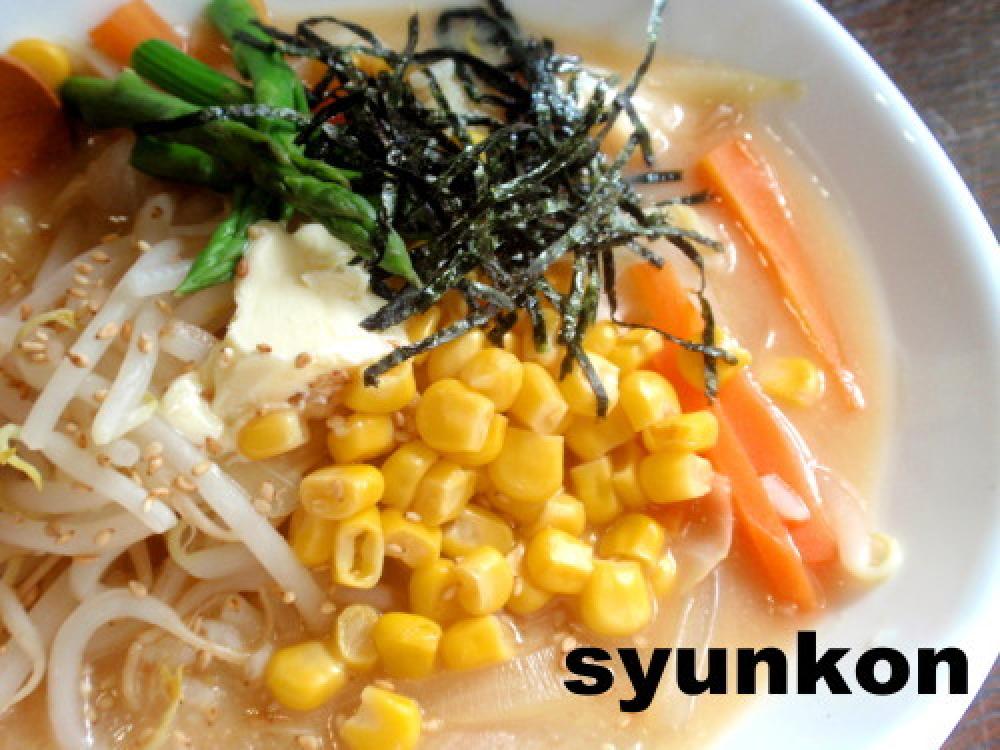 ![]() 器にもり、さっき取り出したもやしとアスパラ、コーン、刻み海苔の乗せ、さらにゴマをかけ、バターを乗せる。
