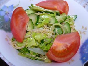 ①のボウルに②のそうめんときゅうり、レタスを入れ和える。