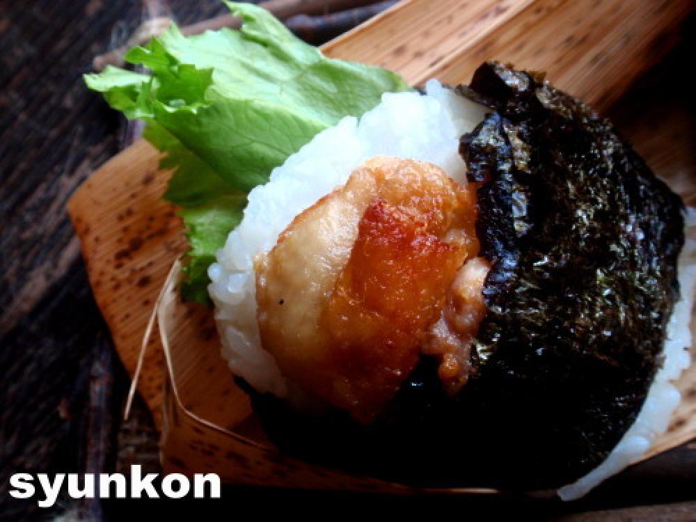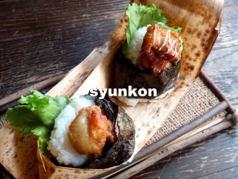 ![]() あとはもう好きに、握ったご飯にから揚げを埋め込んでレタスと海苔でくるっと。