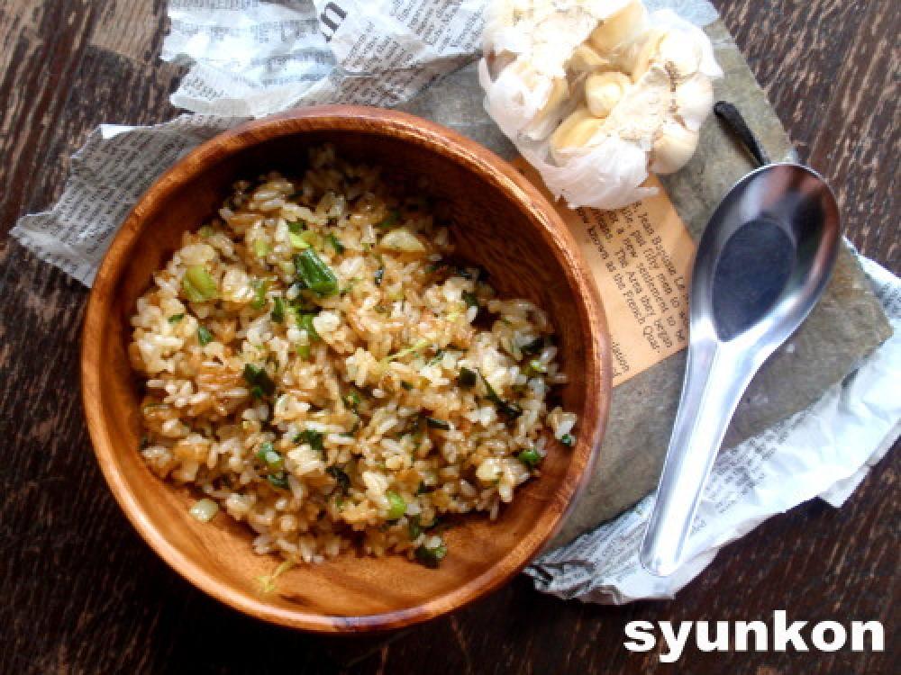 フライパンにゴマ油とにんにくを入れて火にかけ、ネギも加え、弱火でじっくり炒める。