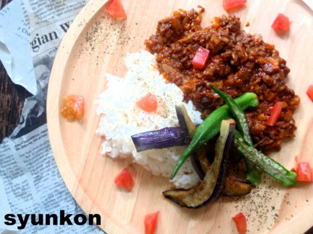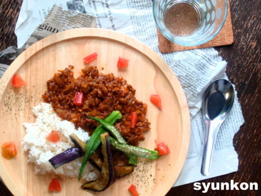 ![]() 茄子とオクラを素揚げにし、ご飯とルーを盛った上に「支えあい」の状態で立てる。
