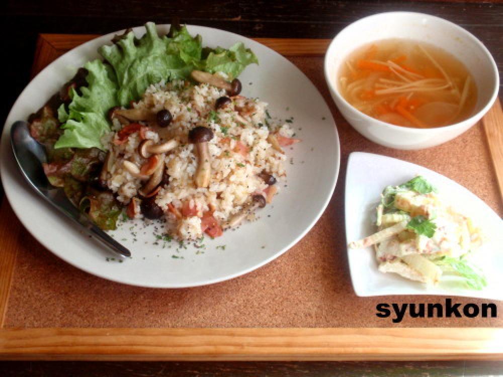 玉ねぎはみじん切り、ベーコンはちっさく、しめじは石づきを取り、にんにくは薄切りにする。