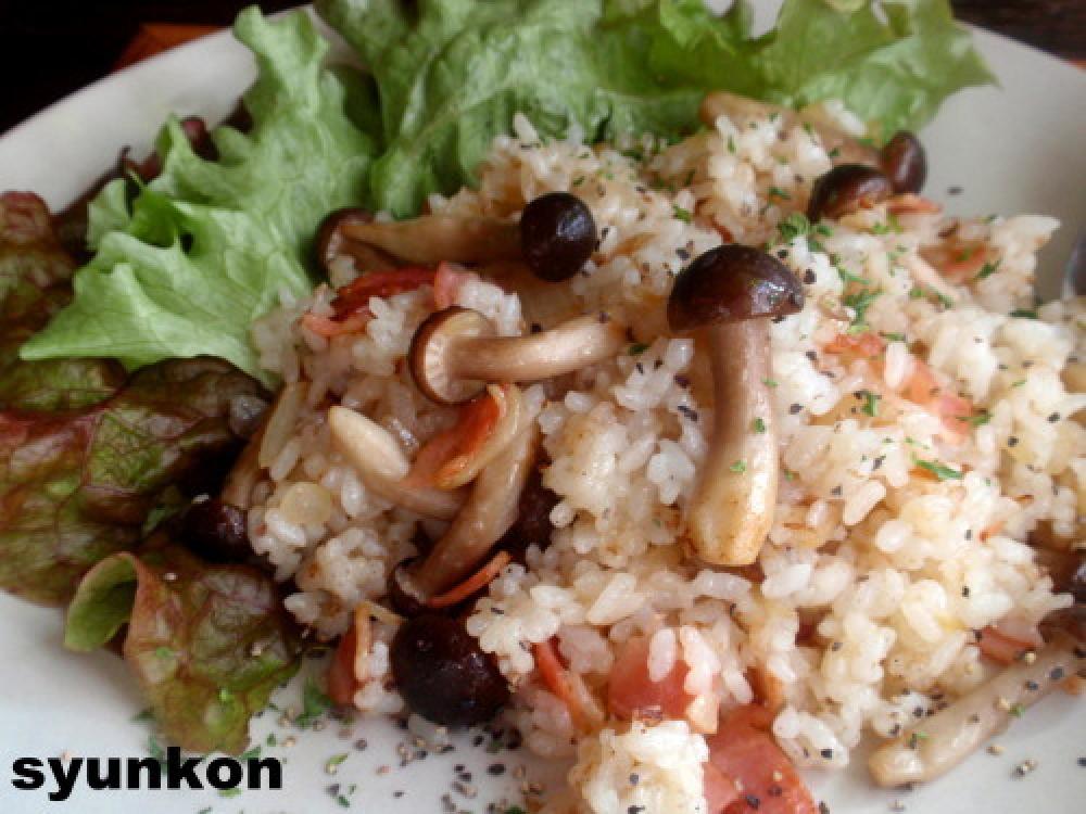 しめじも炒め、全体がしんなりしたらご飯を投入する。(※not もち米)