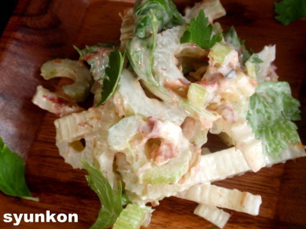 ![]() <セロリのおかかマヨ和え>セロリは薄切りにし、マヨネーズ、かつお節、粉末ダシ(もしくはめんつゆ)で和える。