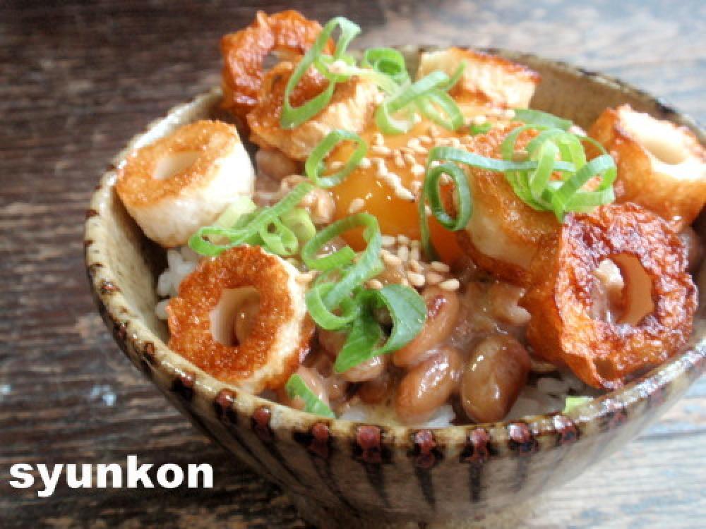 ごはんに納豆を乗せ、卵黄も乗せ、上に焼いたちくわを乗せ、がーっと混ぜて一気にかきこむ。