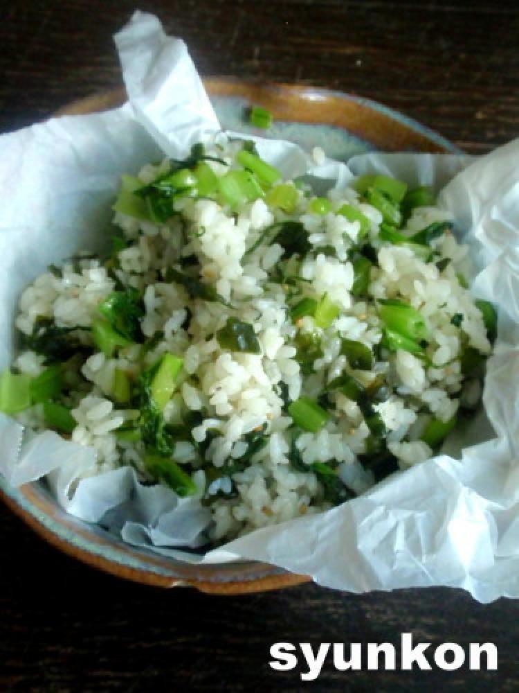 ご飯にワカメと小松菜とゴマを混ぜ、味を見て塩とゴマ油を足す。結構塩の量いります。
