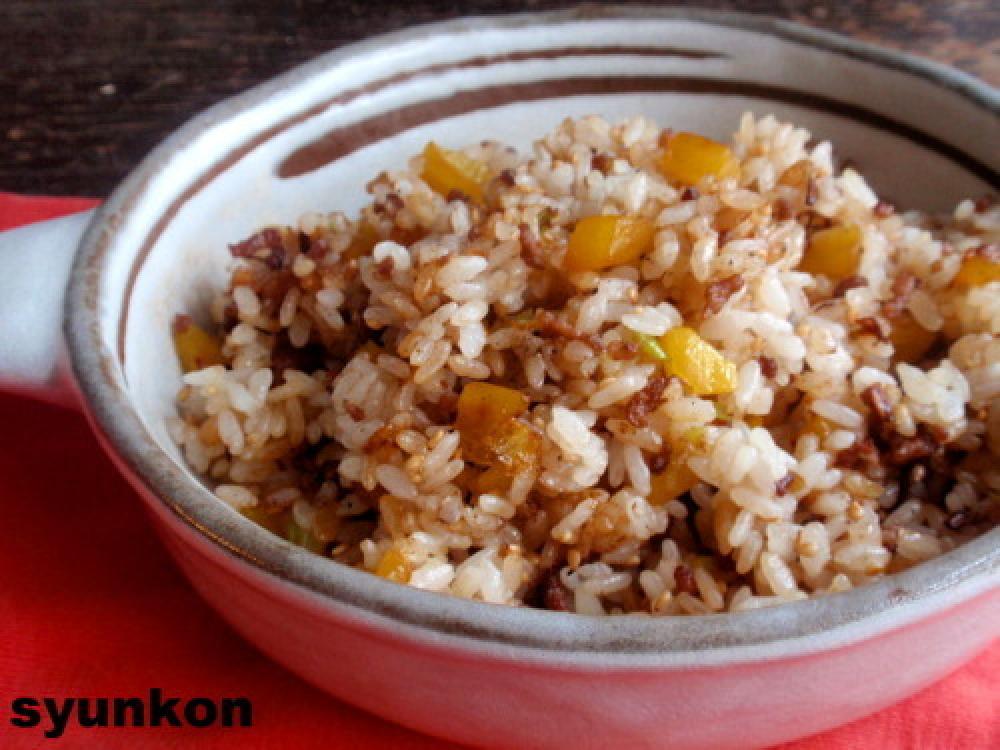 ひき肉とネギを炒め、色が変わったらたくあんを炒め、ご飯を投入し、最後に塩、こしょう、醤油、ゴマ油で
