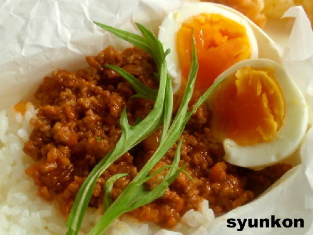 ご飯の上に乗っけて、半熟卵も乗っけて、水菜をはらりと