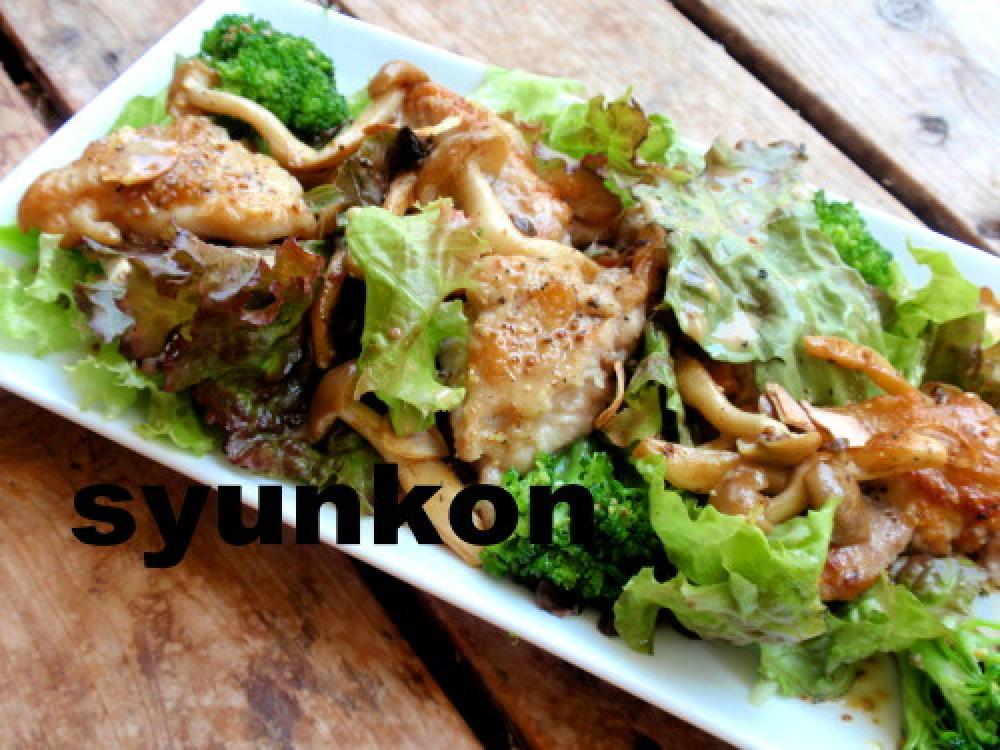 ![]() 水気を切ったレタスと、ブロッコリーを適当に並べ、鶏も適当にならべ、Dを混ぜ合わせたものをかける。