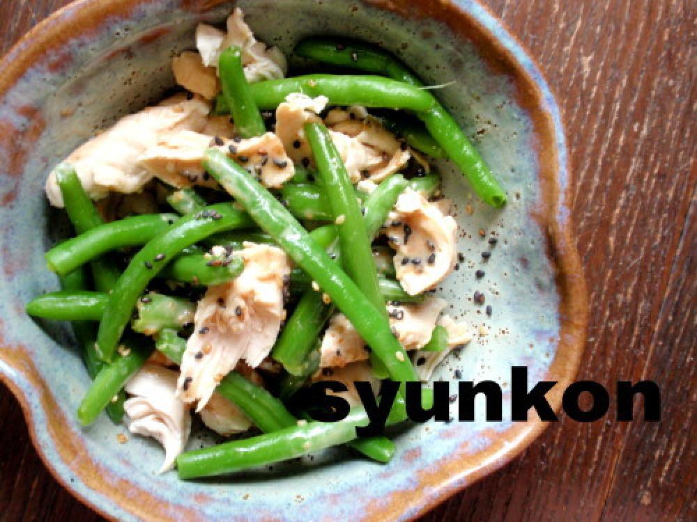 いんげんまめの筋をとって茹で、ささみもめんどくさいから一緒に茹で、