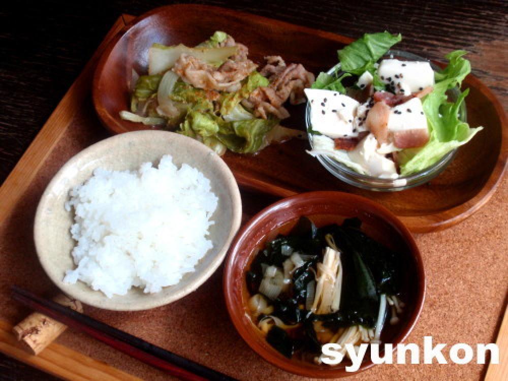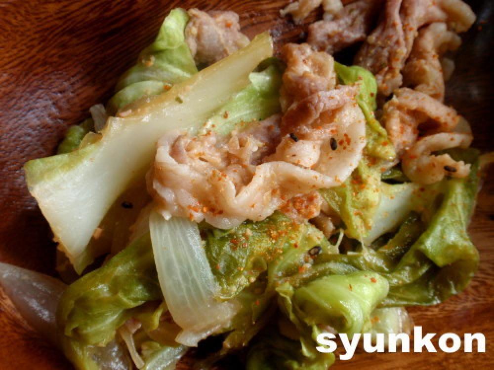 フライパンにキャベツと玉ねぎを広げて乗せ、その上に豚肉を広げて乗せ、水を1/4カップほどかけて、火にかける。