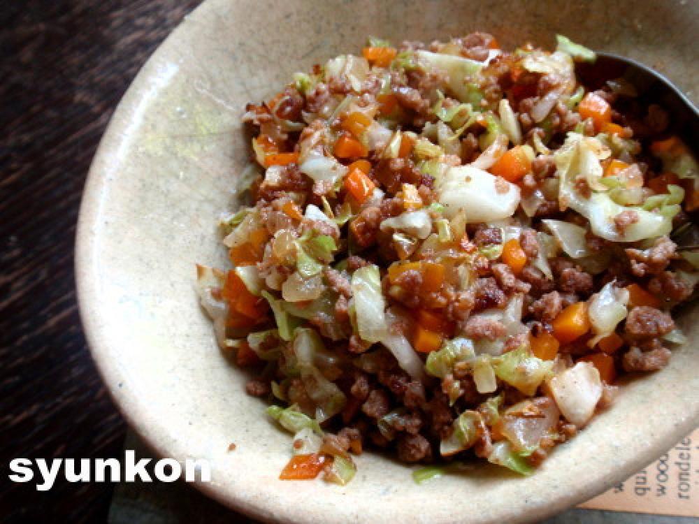 塩を加え、しんなりしたらひき肉、キャベツ、チューブのしょうがを加えて炒め