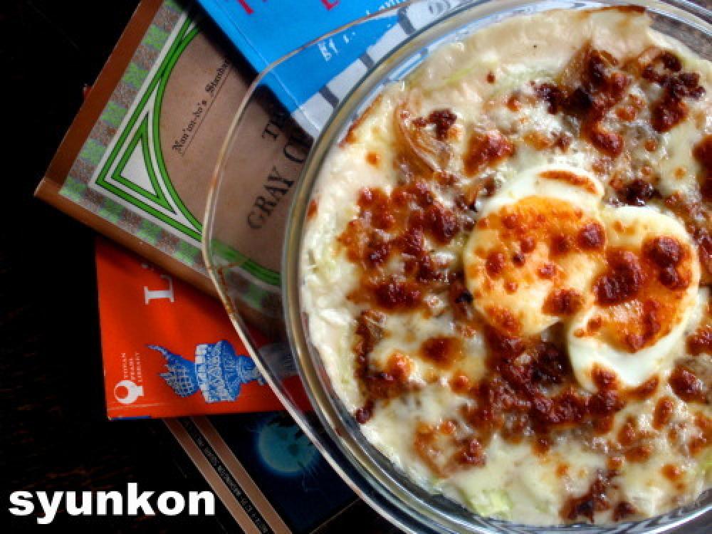 ひき肉を広げて乗せ、卵を半分に割って乗せ |