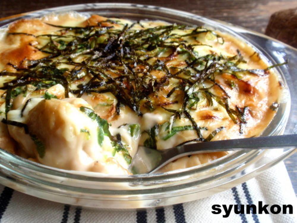 出来たらさっきの芋と豚たちにぐっちゃ~と混ぜ、グラタン皿に移し、上にチーズを乗っける。