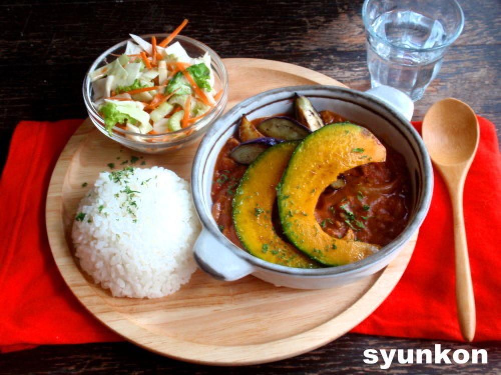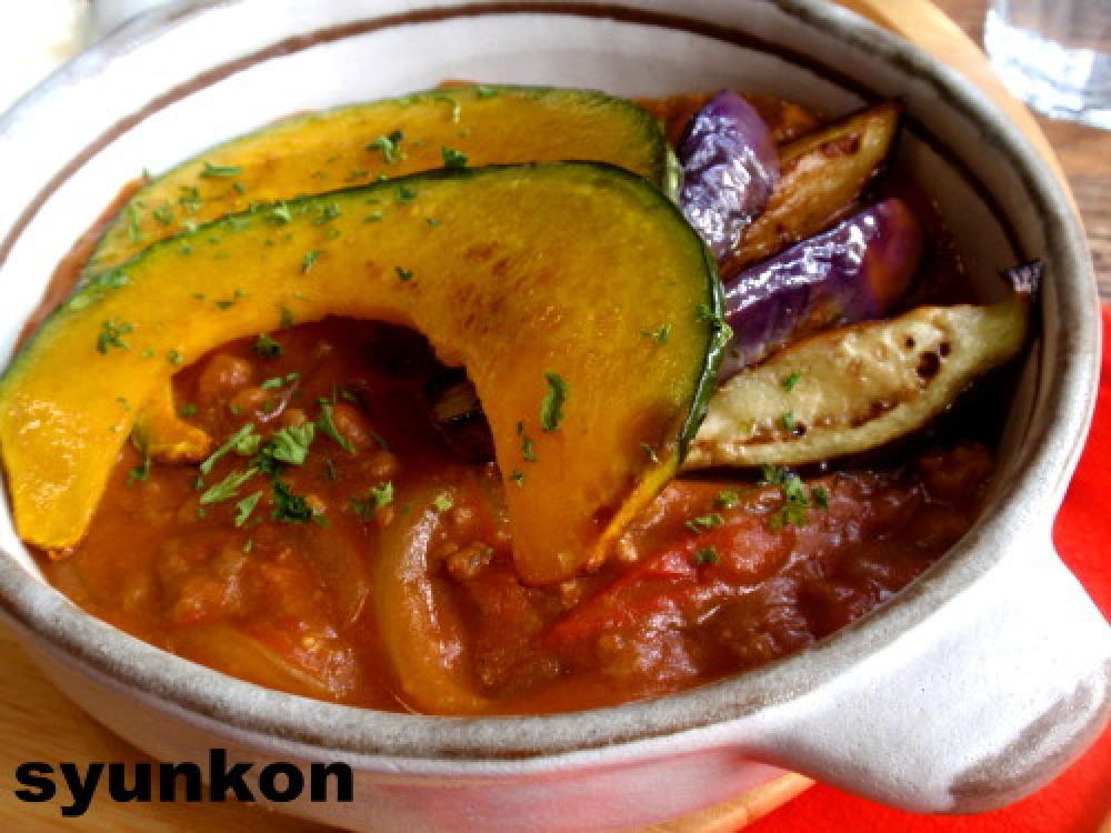 ほんで、茄子は縦に6等分ぐらいに切って、かぼちゃも薄切りにして、フライパンで多めの油で焼いて、乗せる。