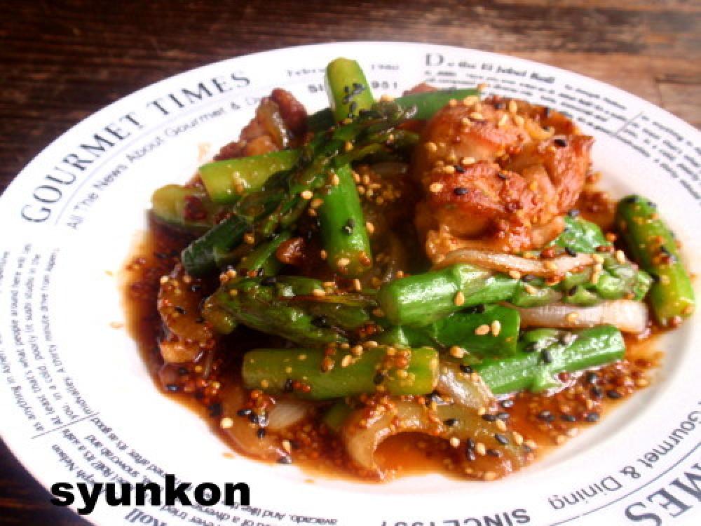 こんがりしたら裏返して弱火にし、中まで火が通ったら取り出し、アスパラと合わせる。