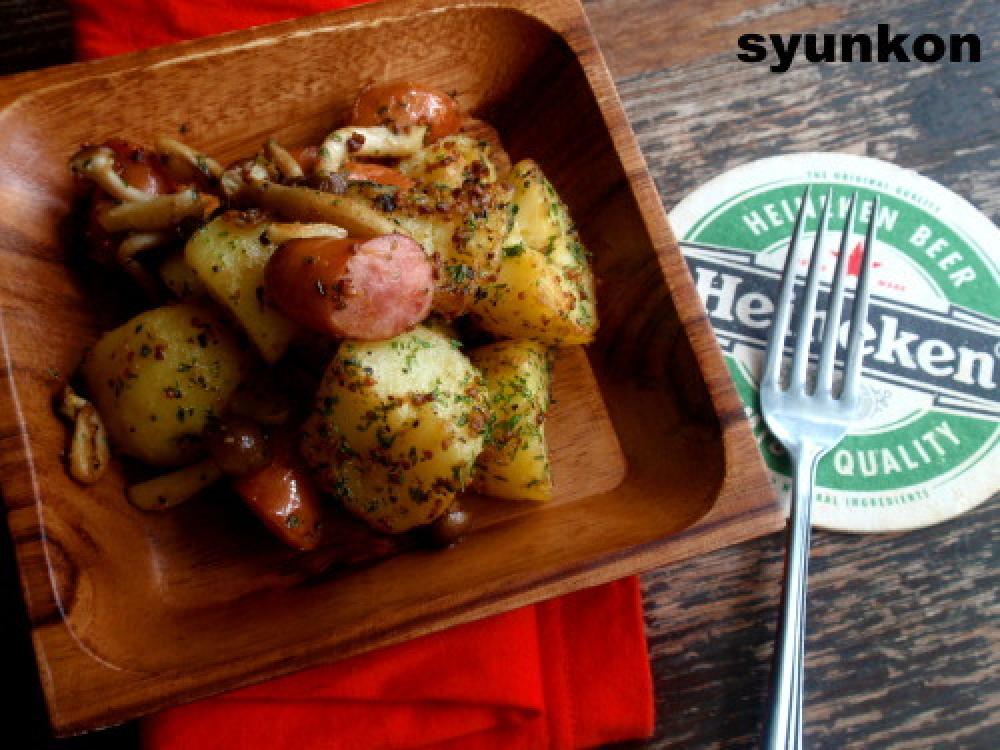 フライパンに油(できればオリーブオイル)を多めに注いで熱し、ウインナー、しめじ、じゃがいもの順に