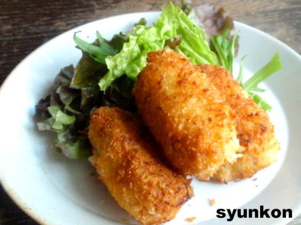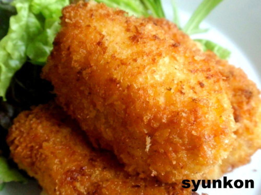 ![]() 固まったら5つぐらいに分け(中途半端な)、小麦粉、卵、パン粉をつけて油で揚げる。