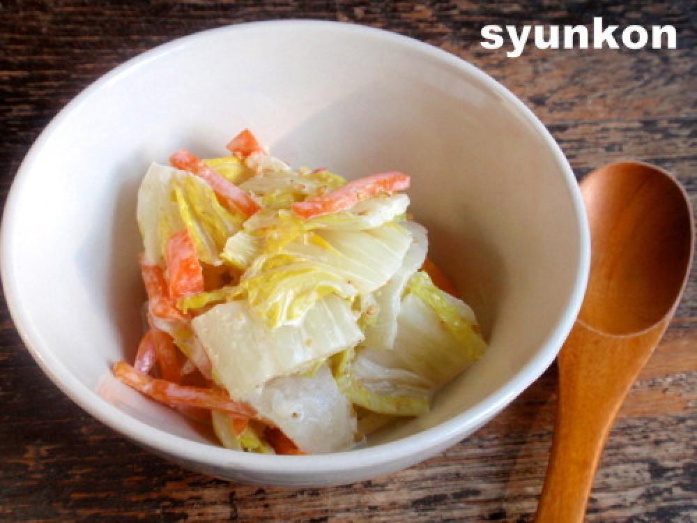 にんじんは細切り、白菜は食べやすい大きさに切り、両方茹でて水気を絞る。