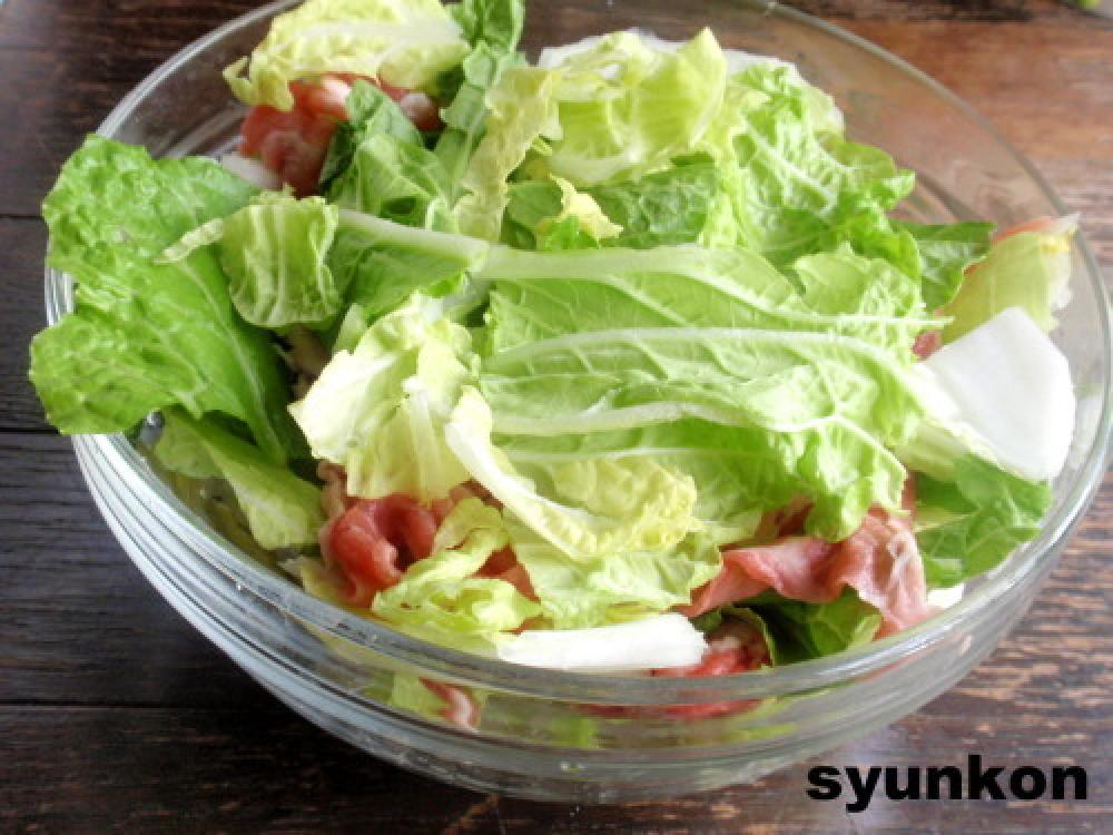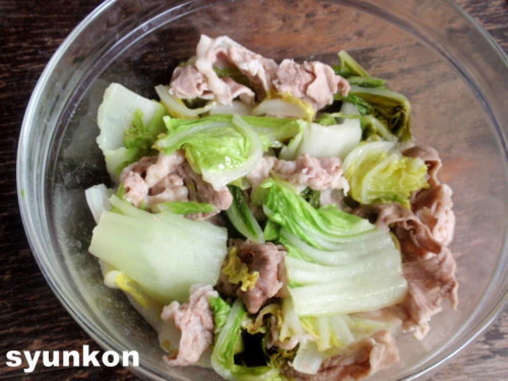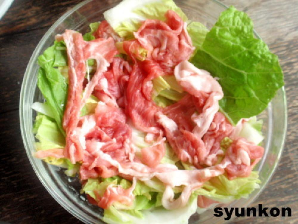 ![]() 白菜と肉は食べたい大きさに切り、耐熱ボールに重ねていく。