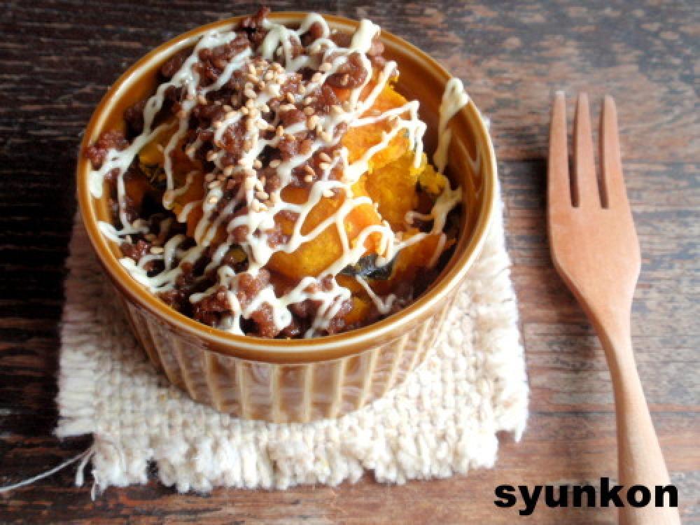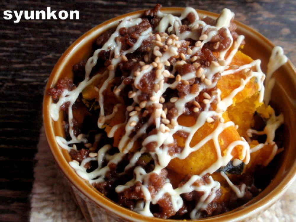 ![]() いれもんに、つぶしたかぼちゃ、ひき肉、マヨネーズ、かぼちゃ、ひき肉、マヨネーズってノリでいれる。上にゴマをふる。
