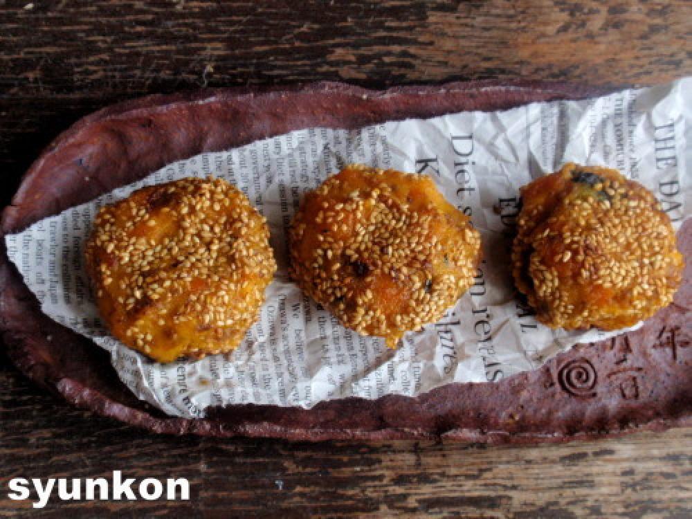 ![]() マヨネーズを混ぜずにひき肉とかぼちゃをよく混ぜて丸めゴマをまわりにつけて、フライパンで焼く。