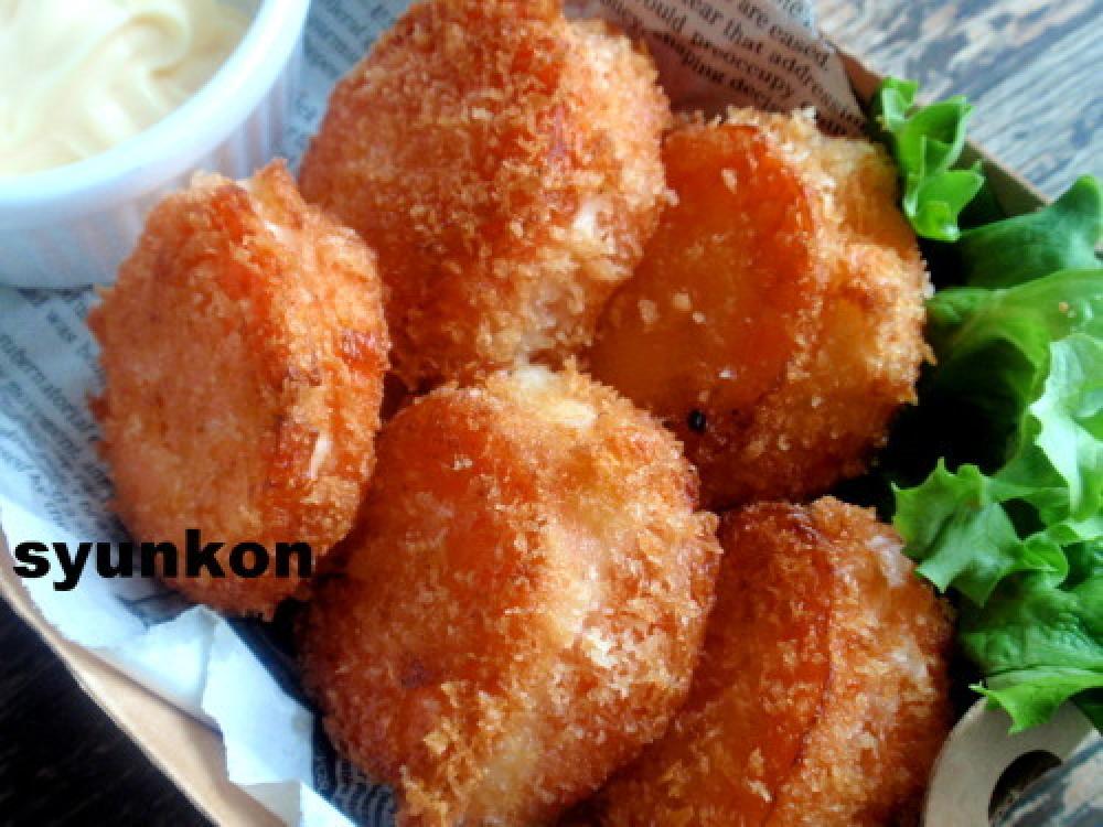 ![]() 小麦粉と水を混ぜてどろっとさせたものにくぐらせ、パン粉をまぶしていい色に揚げる。