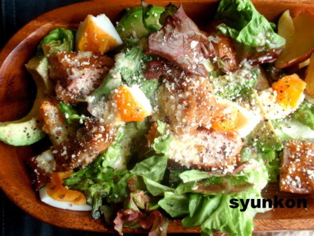![]() あとはもう、ちぎったレタスと切ったゆで卵とアボカドをうまい具合に盛り合わせてBと残ったタレをかけ、チーズと胡椒をふる。