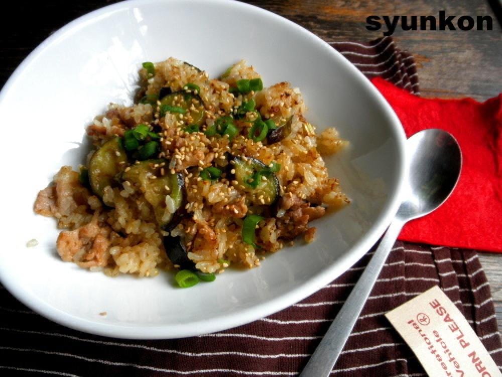 茄子に油がまわったらAをじゃーっと加え、ごはんを投入する。