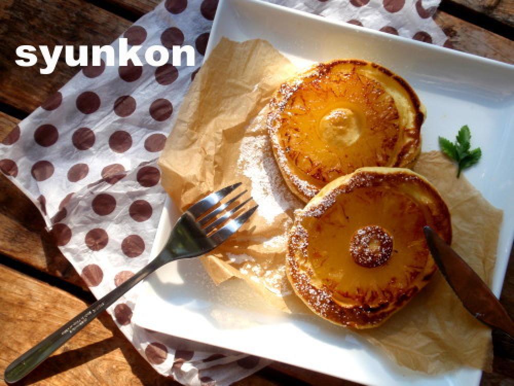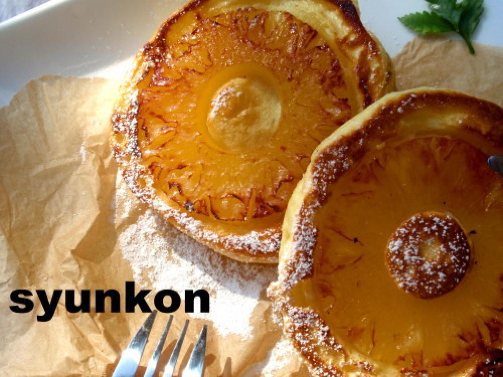 ![]() その上に生地を裏返して乗せ、火を通します。こうすると綺麗に見えます。パインアップルが。