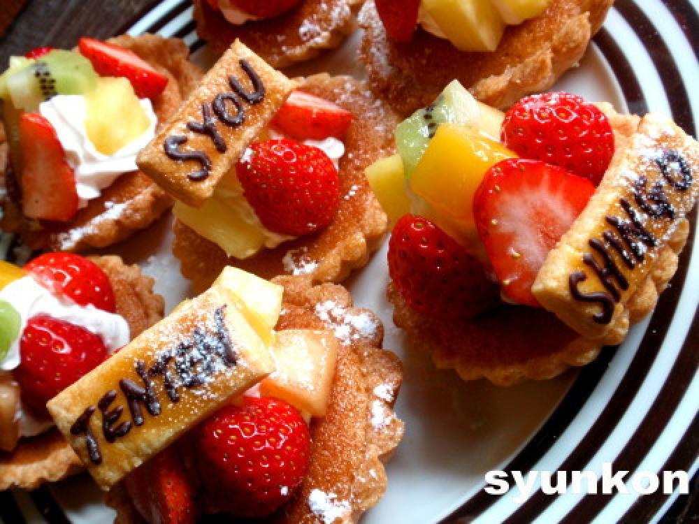 ![]() <飾り付け>タルトの真ん中にホイップクリームをしぼって、いちごやらなんからを飾る。