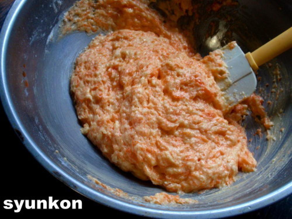 卵を1個づつ加えて混ぜ、すりおろしたにんじんの汁気を軽く絞って加える。
