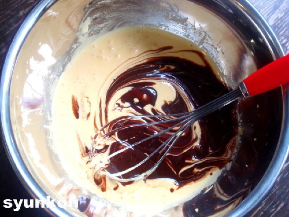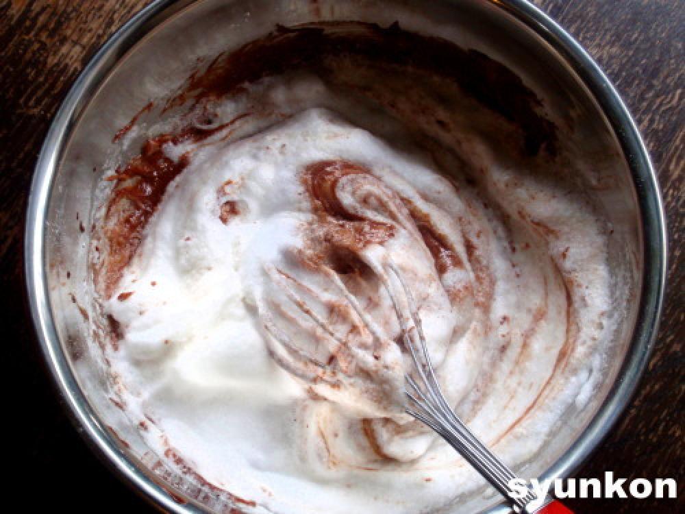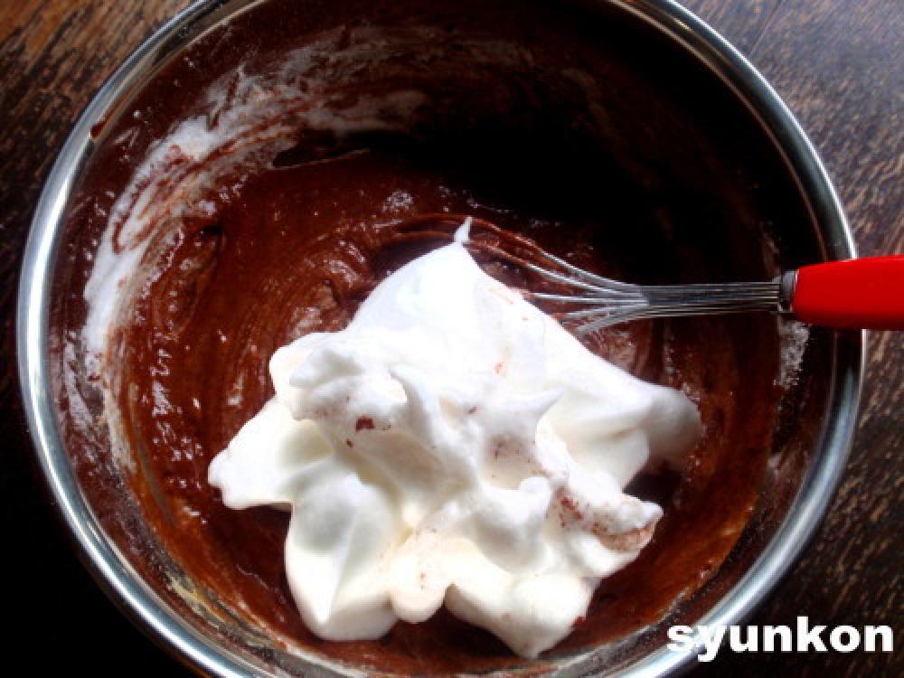 ![]() もこもこになって、角がたつぐらいまで泡立てたら、さっきのボールに2~3回に分けて混ぜます。