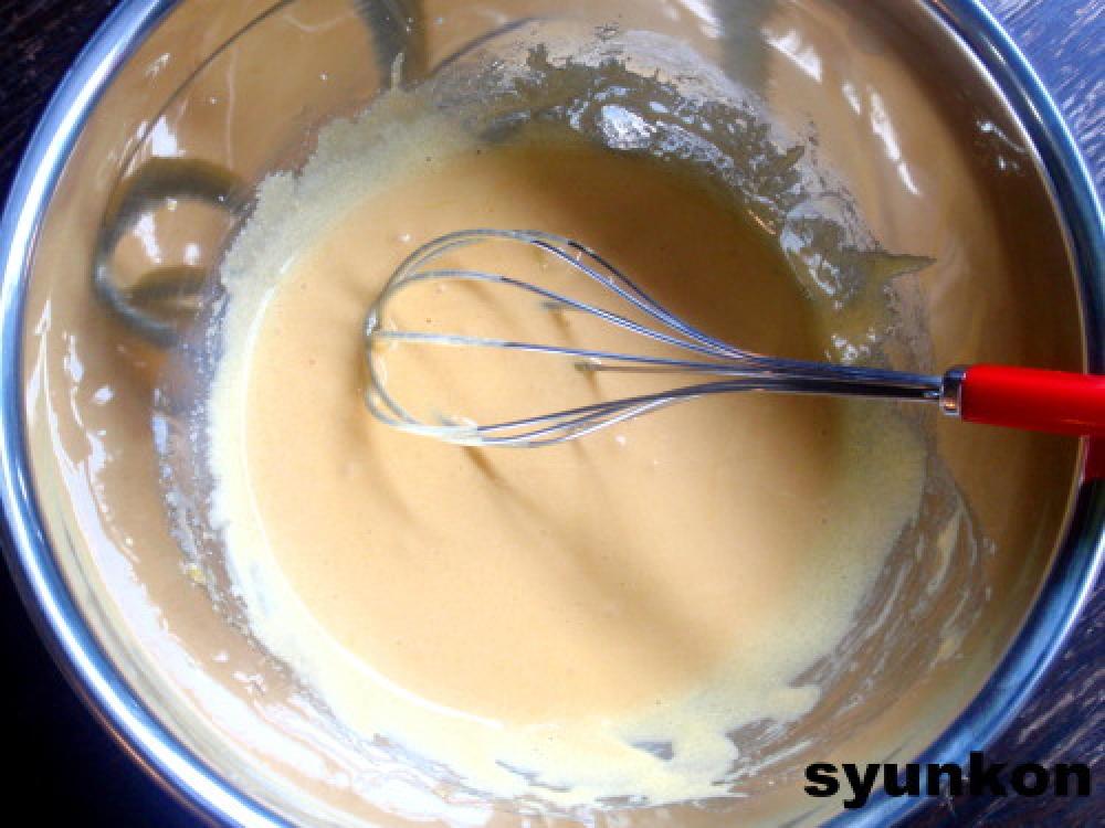 ![]() 中身を作る。卵黄に砂糖をちょっとだけ残していれ、泡だて器で混ぜる。白っぽいクリーム状になるまで混ぜる。ファイト。