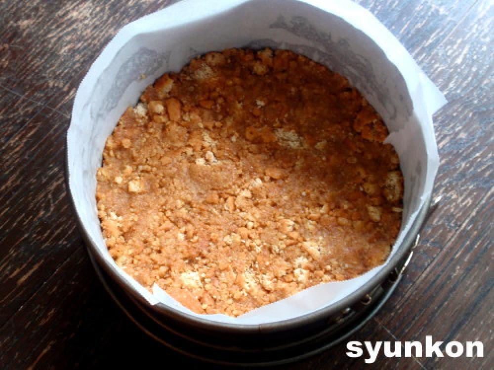 底を作る。バターを耐熱容器に入れてレンジで1分ほどチンするか、鍋で溶かす。