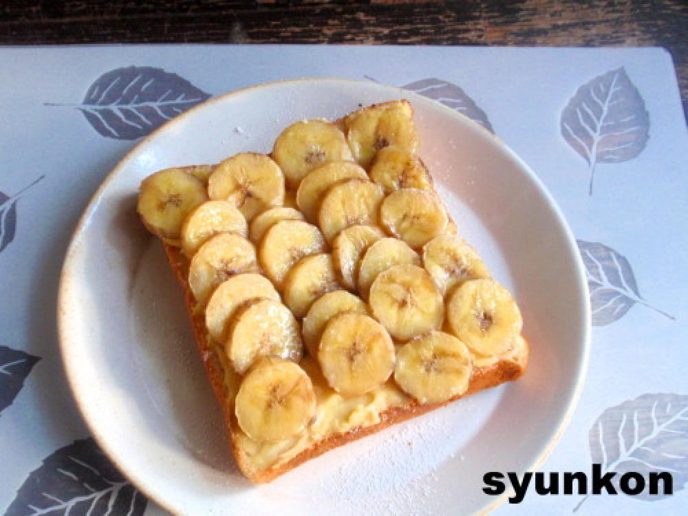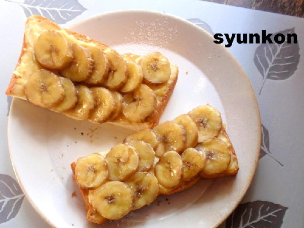 それを食パンに塗り、バナナを並べ、トースターで食パンに焦げ目がつくまで焼く。