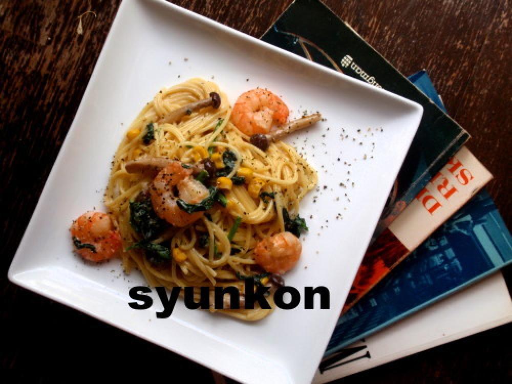 ![]() スパゲッティとエビをザルに開け、フライパンにわっさ~入れて絡める。