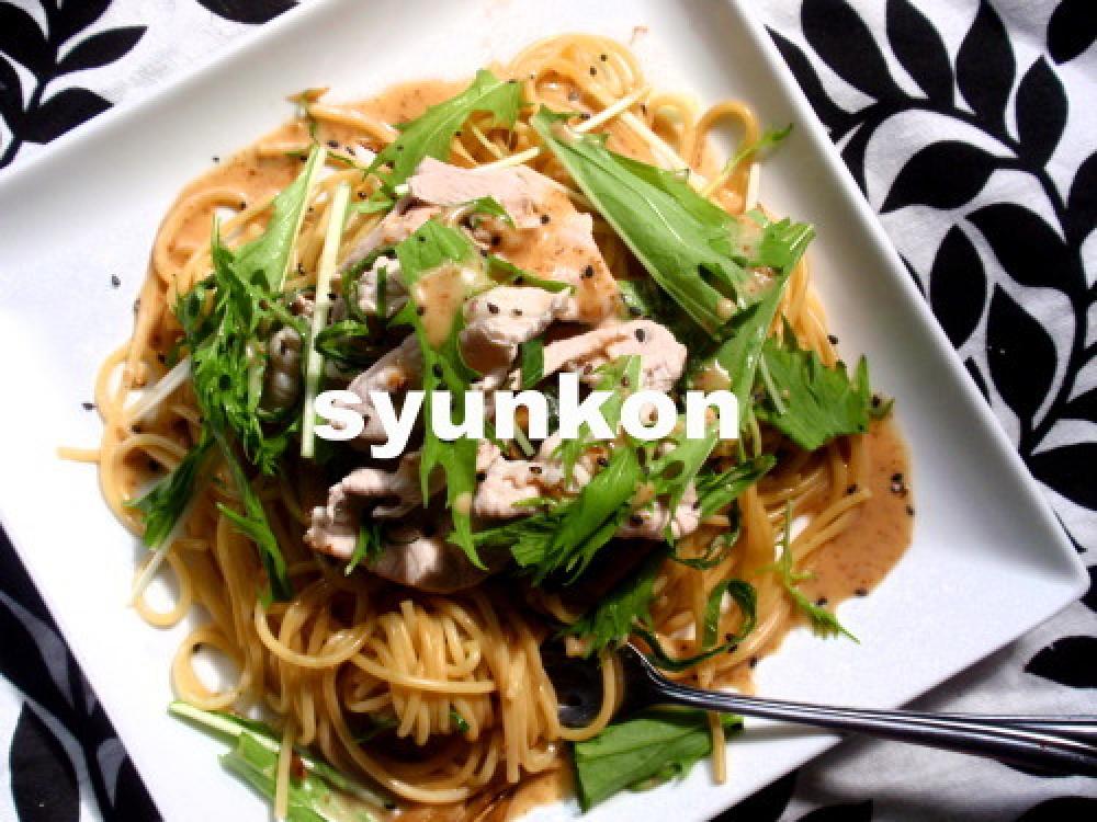 ![]() 皿に盛り、ゴボウ、豚肉、残りの水菜、大葉を乗せ、ゴマドレをかけ、黒ゴマをふって完成。