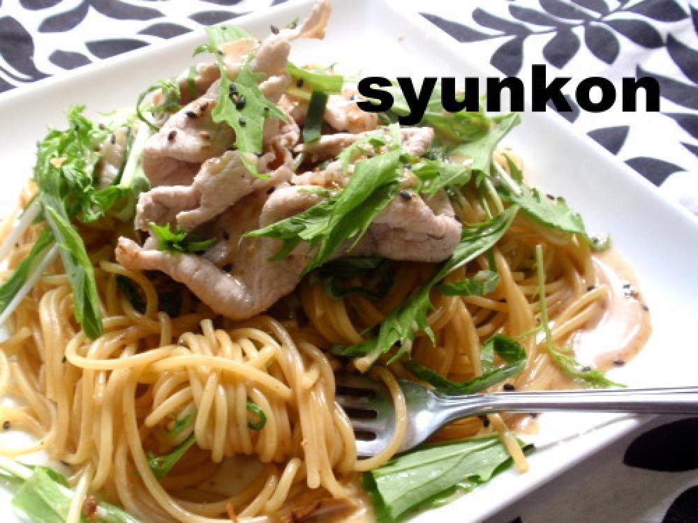 茹で汁と塩を適当に加え、水菜を半分ぐらい加えて絡め(全部後から生で乗せたら、口んなか「水菜ー!!」てなりそうやし)