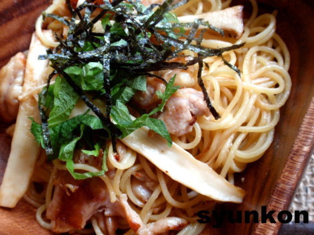 きのこを入れ、火が通ったら酒(※私はただの料理酒です)を加え、粉末だしの素も加え、スパゲッティを投入する。